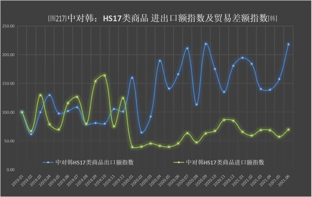 中对韩HS17类商品出口额指数、进口额指数于2019年均围绕基期值横振运行,2020年后走势分化,中对韩HS17类商品出口额指数大幅振荡上扬,近一年有三个月值升幅在基期一倍以上,中对韩HS17类商品进口额指数则大幅回落后横振,指数重心约为基期六成半左右。