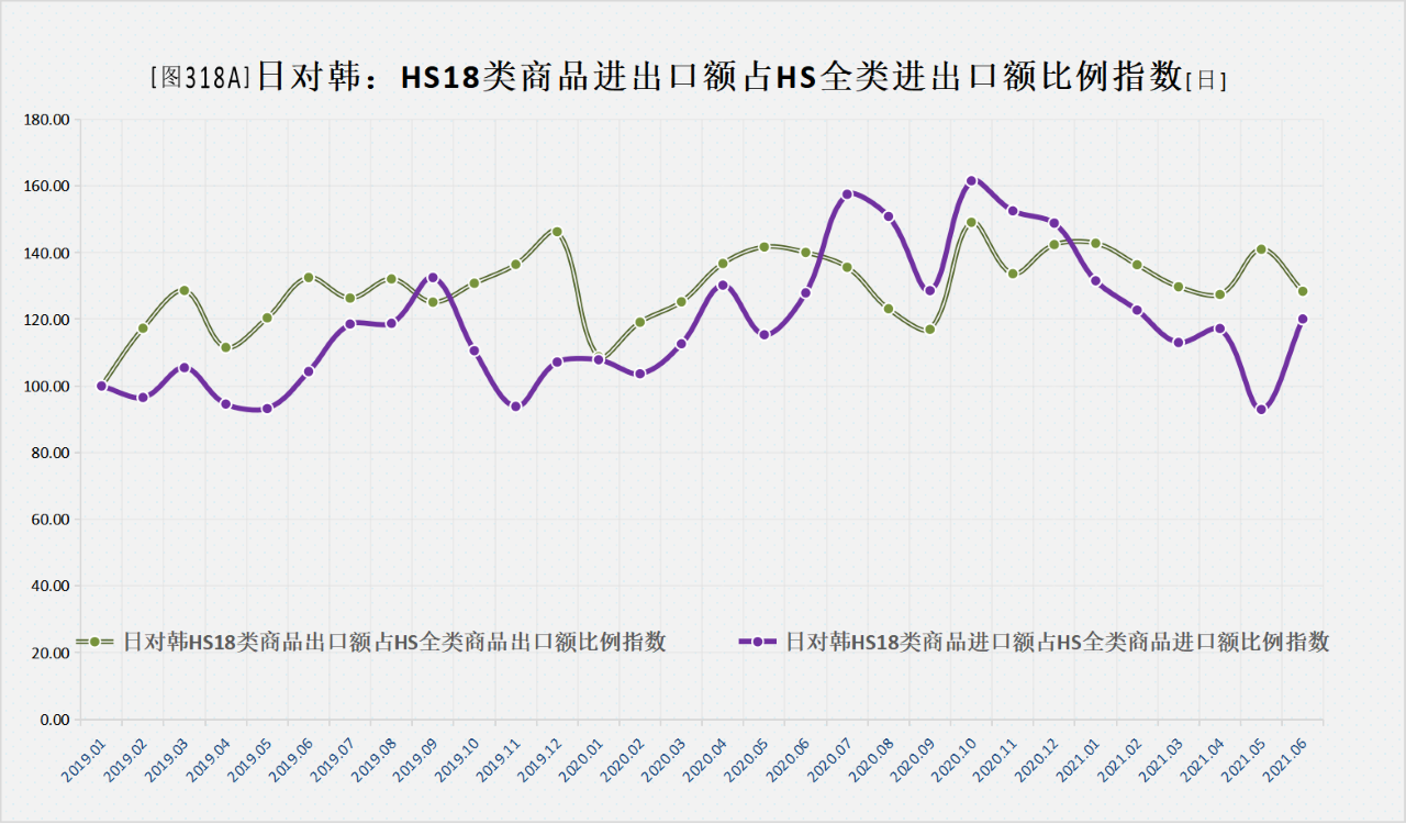 日对韩HS18类商品出口额占HS全类商品出口额比例指数相较于日对韩HS18类商品进口额占HS全类商品进口额比例指数的走势更强一些,前者长期运行于后者之上;日对韩HS18类商品出口额占HS全类商品出口额比例指数重心较基期升幅约三成左右。