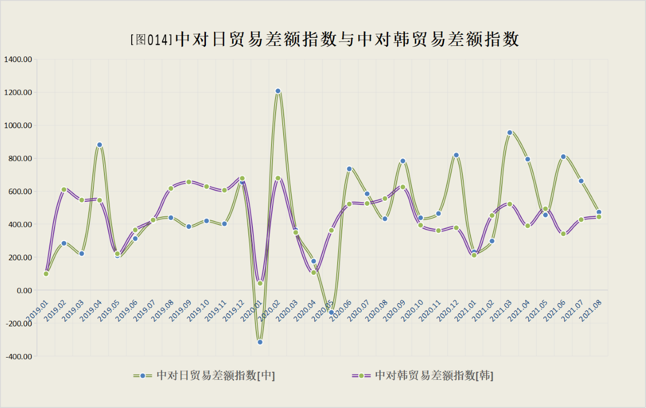 中对日韩贸易差额均为逆差,自基期以来,中对日韩贸易差额指数均呈现横向振荡走势;中对韩贸易差额指数总体稳定;自2020年下半年以来,中对日贸易差额指数重心抬升显著,或者说,中对日贸易逆差增幅突出。