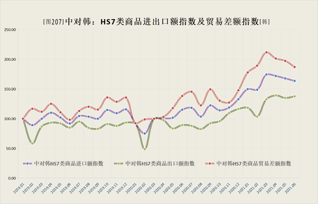 中对韩HS7类商品出口额、进口额和贸易差额三个指数走势相仿,自基期以来大致分两段,前段横振,后端振荡攀升,进口额指数一直强于出口额指数,近来数月,出口额指数重心升幅约三成半,进口额指数重心升幅近七成,贸易差额指数重心升幅近一倍。