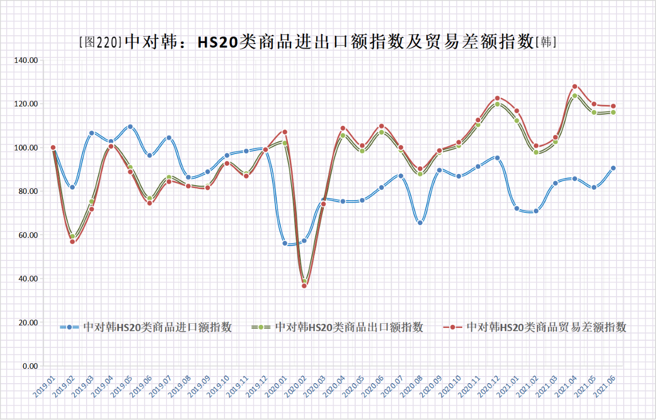 中对韩HS20类商品出口额指数、进口额指数、贸易差额指数均总体现为先抑后扬,出口额指数明显强于进口额指数;出口额远大于进口额,因此贸易差额指数与出口额指数近乎重叠运行。