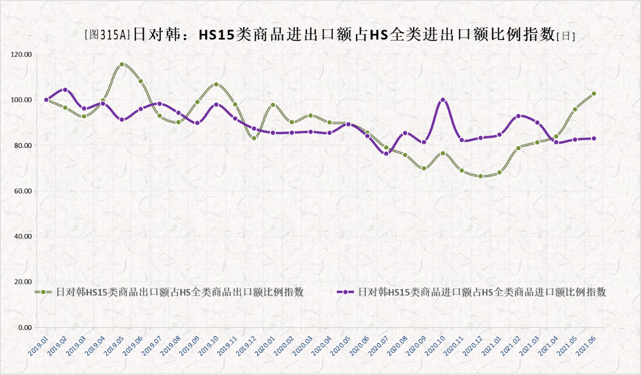 日对韩HS15类商品出口额占HS全类商品出口额比例指数相较于日对韩HS15类商品进口额占HS全类商品进口额比例指数反弹走势更强一些,前者今年6月刚超过基期值,而后者反弹相对乏力。